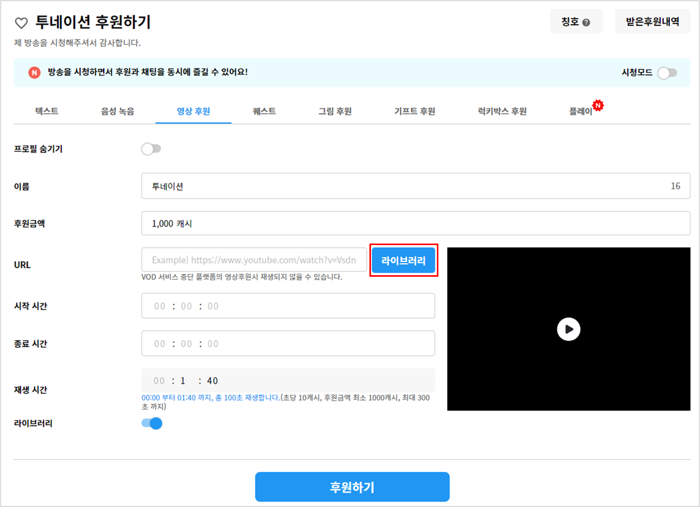 1. 후원 페이지 > 영상 후원 탭 > [라이브러리] 버튼 클릭