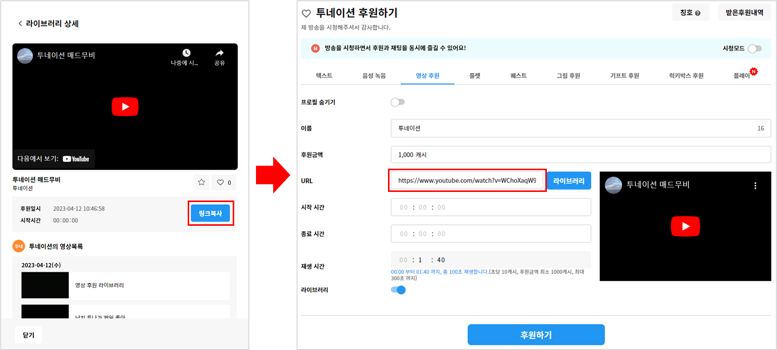 자세한 내용은 아래를 참고하셔서 영상 후원을 진행해 보세요.