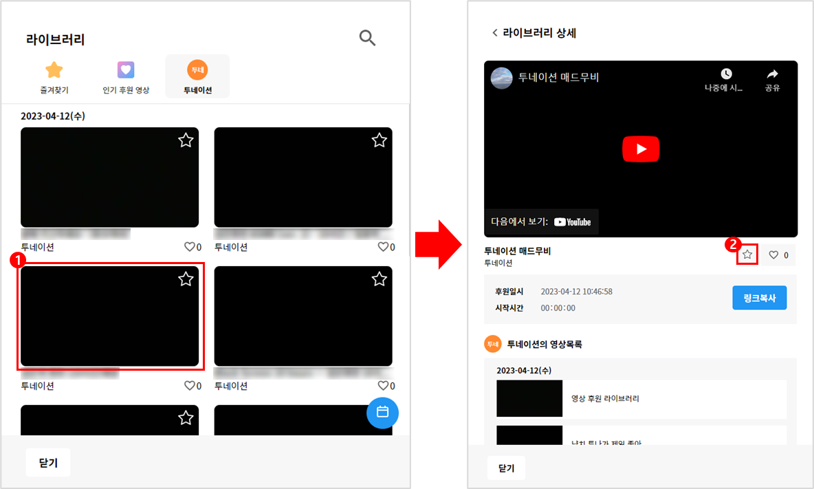 1. 라이브러리 영상 선택 > 라이브러리 상세 '즐겨찾기(☆)' 클릭