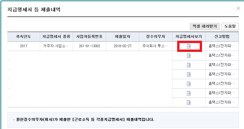 3. 지급명세서 종류가 '거주자 사업 소득 지급명세서' 로 징수 의무자가 주식회사 투네이션으로 되어있는 항목을 찾아 지급 명세서 보기 버튼을 클릭하시면 내역 확인 및 인쇄가 가능합니다.