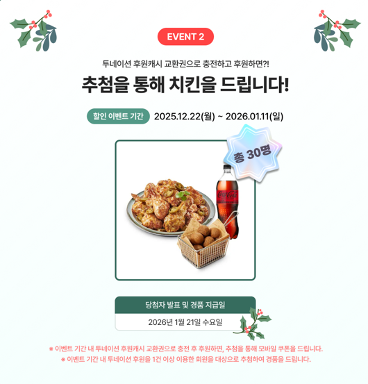 2025년 12월 22일(월)부터 크리스마스와 투네이션 캐시 교환권 런칭을 기념하여 <투네이션 캐시 교환권> 런칭 이벤트가 진행됩니다.